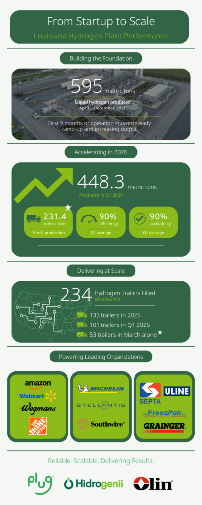 “Over the past year, we’ve seen what’s possible when strong partnerships and operational focus come together,” said Samuel Waldschmitt, Plant Manager of the Louisiana facility. “This plant has grown into a reliable, high-performing operation, and that’s a direct result of the collaboration between Plug, Olin, and the team on the ground in St. Gabriel. We’re proud of the progress we’ve made and excited to continue building on this foundation.”